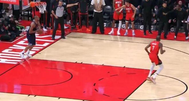申京、阿门在快船球员的注目围观下连续点板,一下,两下,三下……