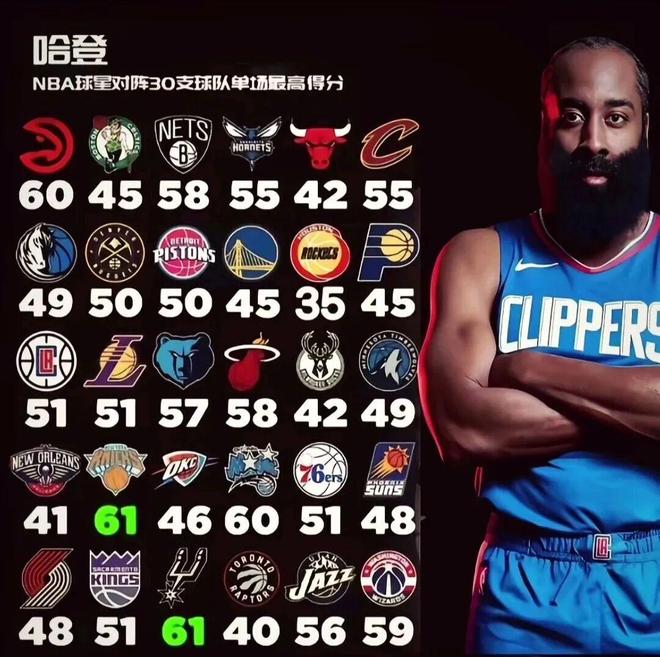 还有一项数据, 哈登生涯打联盟29支球队都曾砍下过40+,仅剩火箭没有(最高35分)。