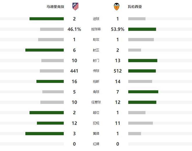 第63分钟瓦伦西亚扳平了比分,贝尔特兰左路内切,晃开上抢的阿尔马达后,突然起脚远射,轰出一脚无解的世界波,皮球擦着立柱飞入球网,让奥布拉克也无可奈何,将比分追至1平,不过蝙蝠军团并没有开心太久,第74分钟替补登场的格列兹曼,前插接到队友挑传后,用一脚世界级的停球,给自己抽射创造出了机会,帮助马竞将全场比分定格为了2-1。